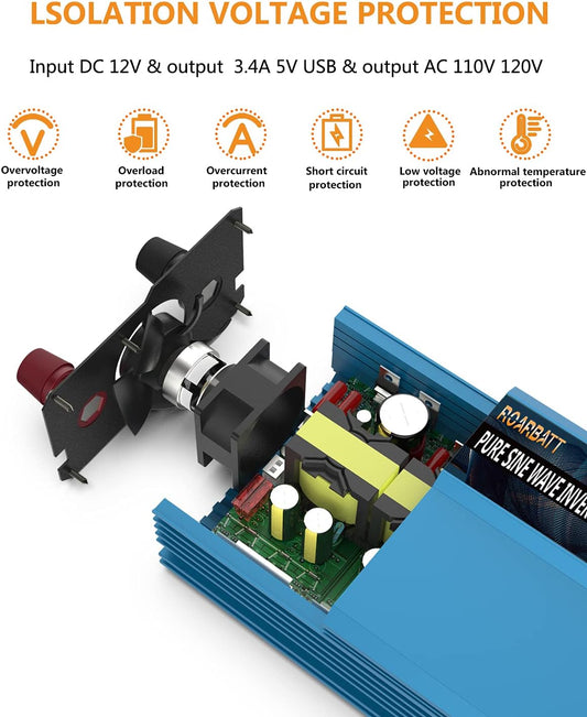 Power Inverters Pure Sine Wave 1000 Watt 12V DC to 110V/120V AC Converter 2 AC Outlets Car Inverter with 3.4A USB Port Cooling Fans and LCD Display